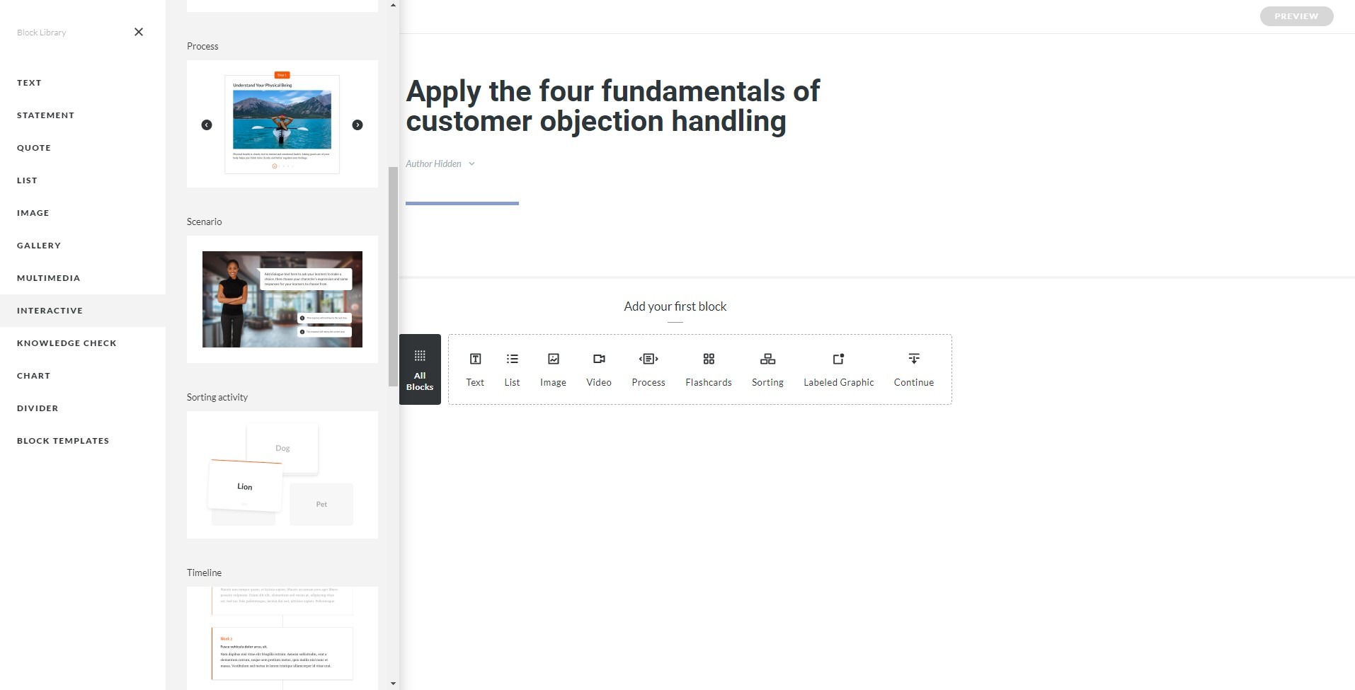 Speaking of blocks, that’s the final thing you will need! Articulate Rise is made up of a number of pre-programed blocks for different types of content. To build your assessment, you’ll want to use a range of the many blocks that Rise has on offer. There are lots of different options for creating interactions in Rise, and you can use a variety of the blocks available to create a scenario that will test your learners’ skills and knowledge.
