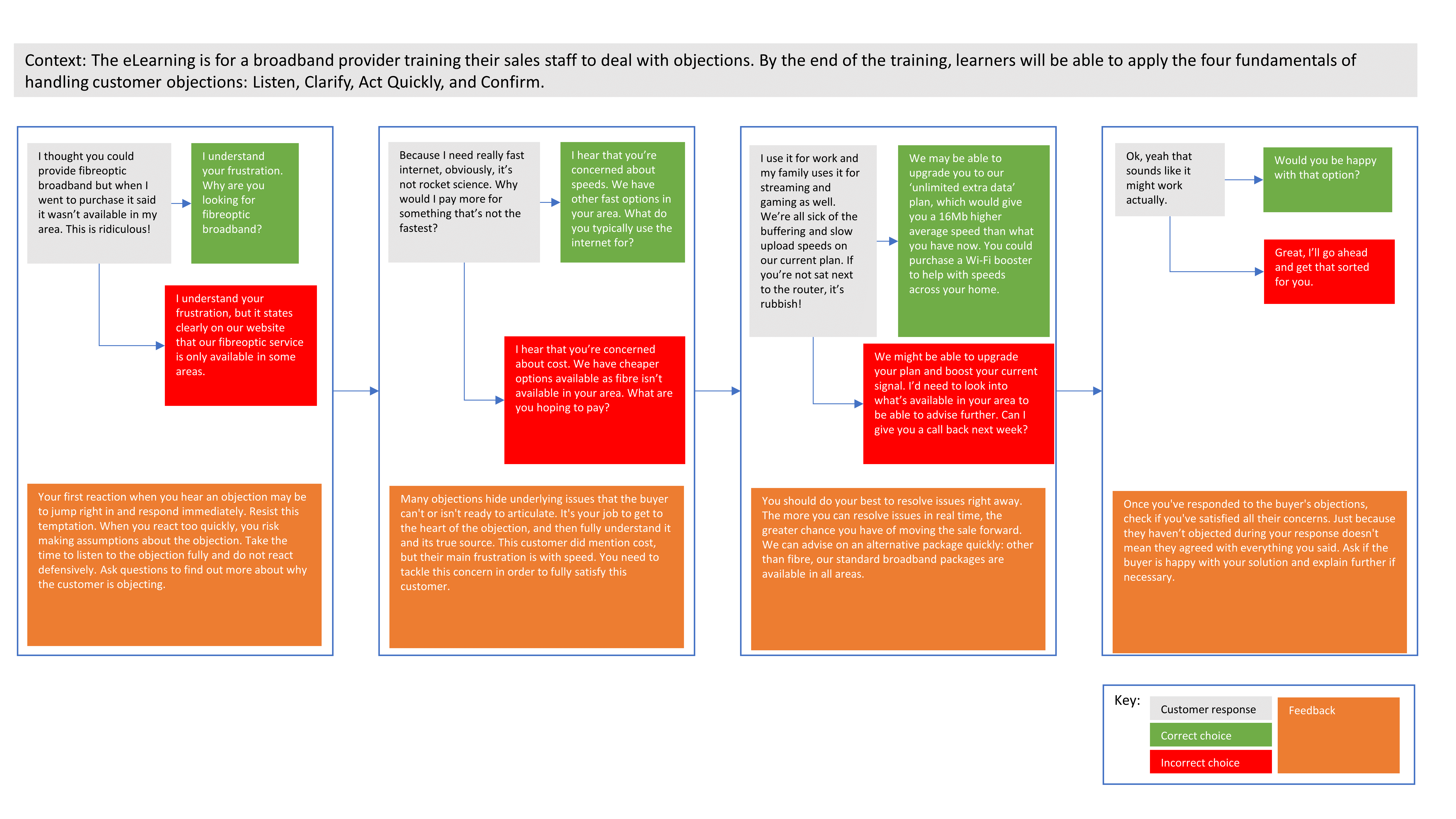 As you can see, there’s just one path on this flowchart. At each decision-point, the learner gets corrective feedback. This can be the same for each decision, different for correct and incorrect decisions, or different for each possible decision. Whatever you choose, make sure that feedback for incorrect decisions, or decisions that aren’t best practice, explains what the learner should have done and the consequences of making this incorrect decision in real life.