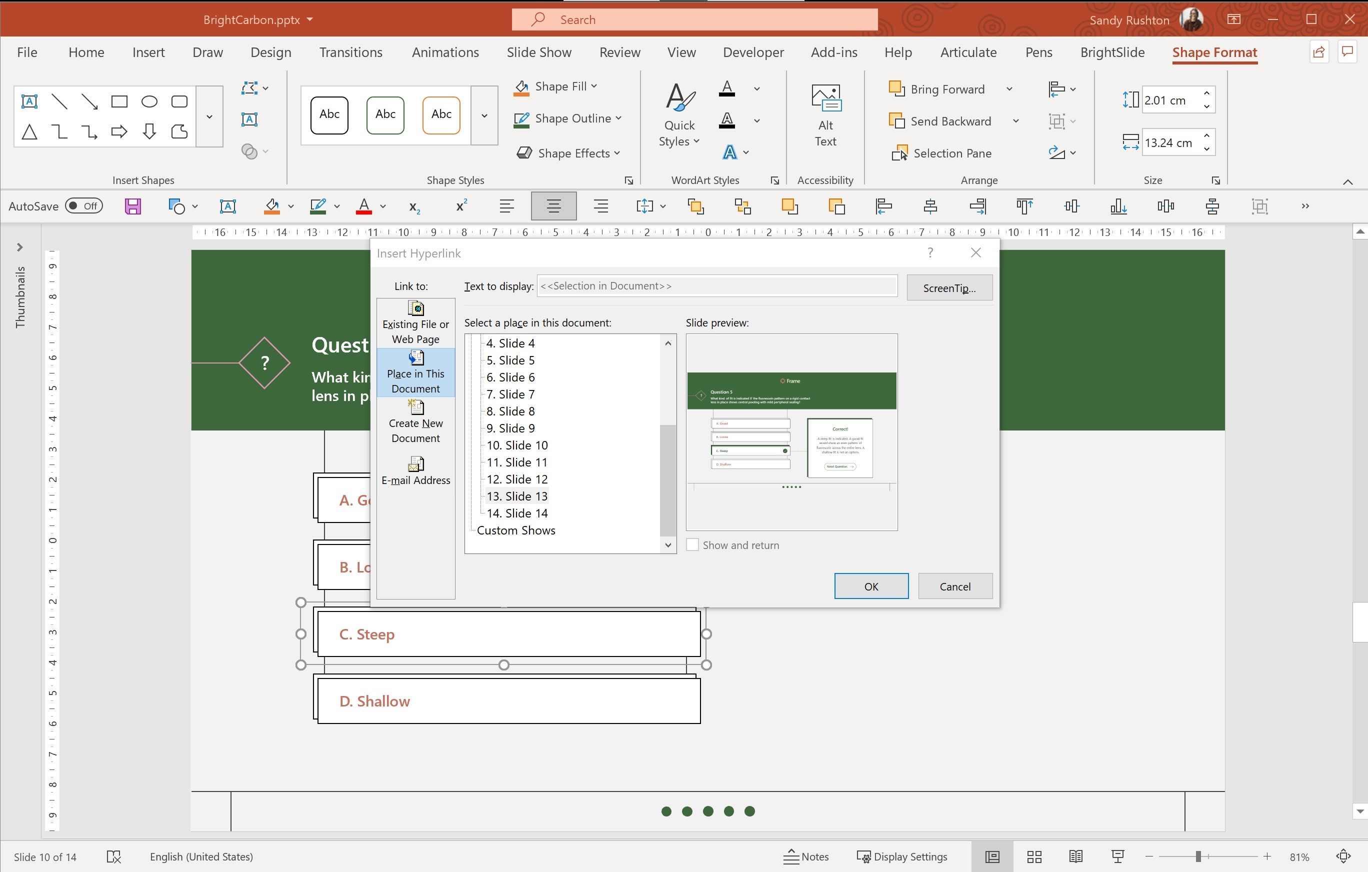 3. Now, go back to your question slide. Right click on the correct answer, and select Link. A pop-up will appear with different options. Select Place in this document and then select the correct feedback slide you just made from the list of Slide Titles. The pop-up will show you a preview of the slide which will help you find the slide you need. Select OK and your hyperlink will be live.