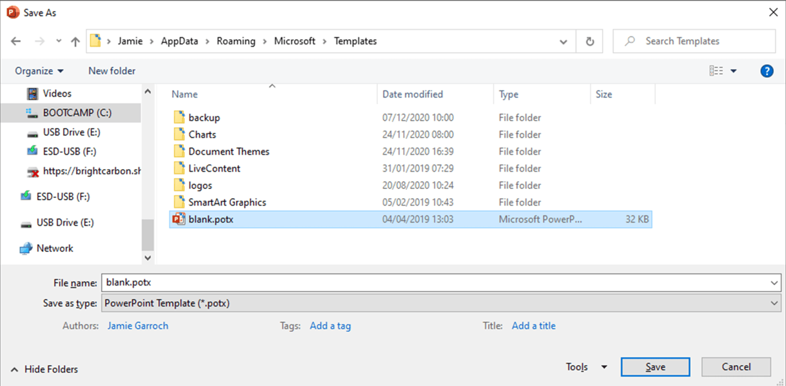 Save file as a template. To do this, click File>Save As or Ctrl+Shift+S and then click the Save as type drop to down to locate PowerPoint Template:When you do this, PowerPoint in its infinite wisdom will change the folder to where your personal templates are stored, something like C:\Users\Name\Documents\Custom Office Templates but this is not where the default template is stored!