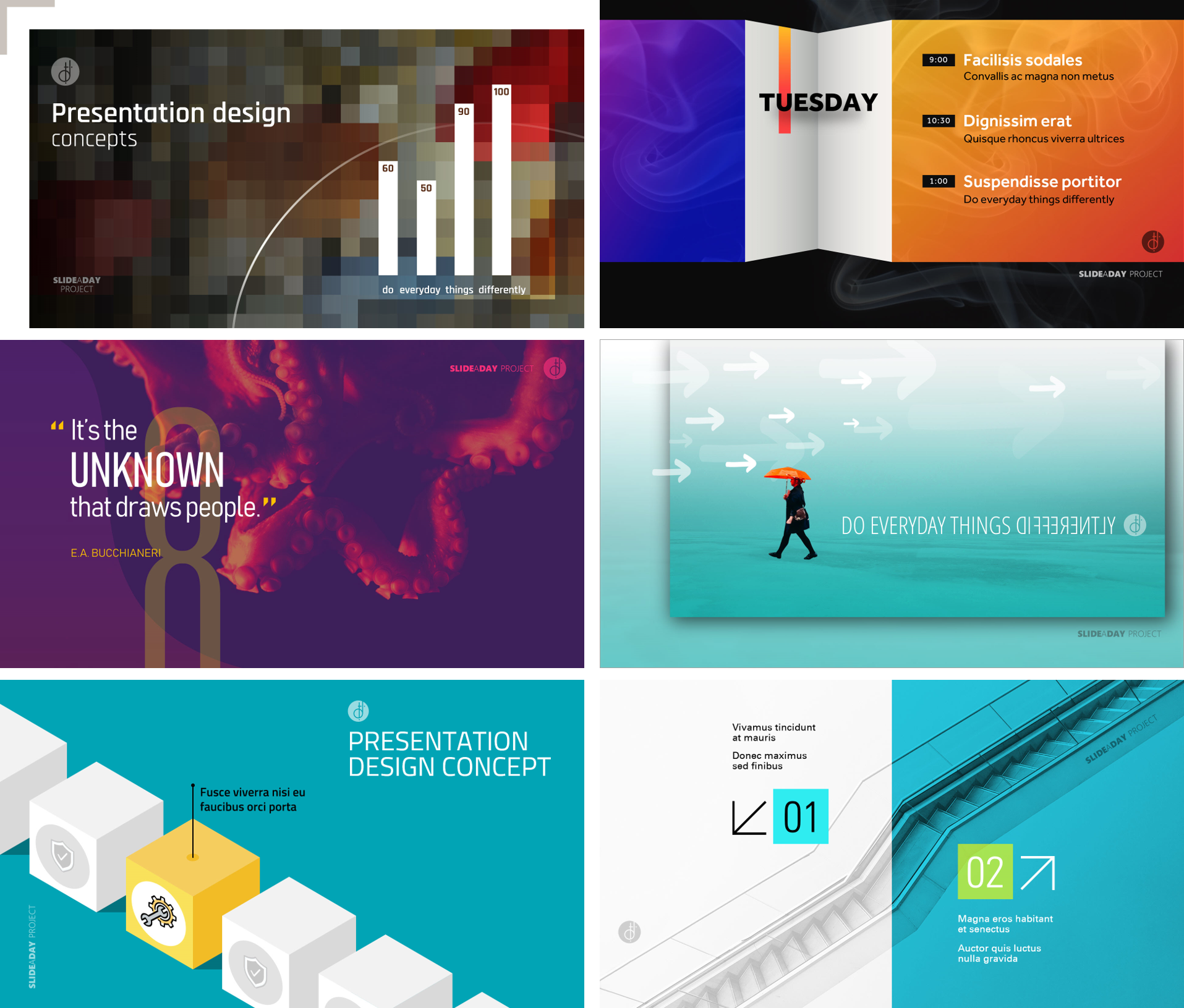 For this project, I wanted to explore new ideas and push myself creatively. I wanted the daily concepts to be fresh and unique. So, #SlideADay was an exercise that pushed me. The bonus is a library of new concepts to display on my site. Most of my client work is confidential, so I’m unable to share many examples in my portfolio.