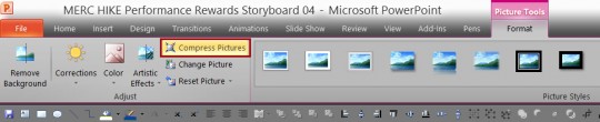 Secondly, compress all your pictures. This can be a little tedious, but it will most certainly help (at least the size of your file). You can access this by clicking on the picture (or selecting several), check you are in the “Picture Tools / Format” tab, and select “Compress Picture”. A dialogue box will appear with different options. You can either choose 220ppi or 150ppi, as none of those will make your picture lose quality.
