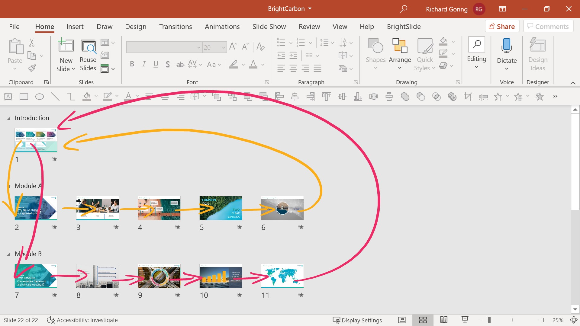 That’s because all the slides have been grouped into different sections, or in this case modules A, B, C, and so on. Why is that useful? Well, PowerPoint sections are a great way to categorize slides and organize your presentation. You can move sections around more easily, collapse all the slides to see an overview of the flow, and, perhaps mostly usefully, use sections to navigate.