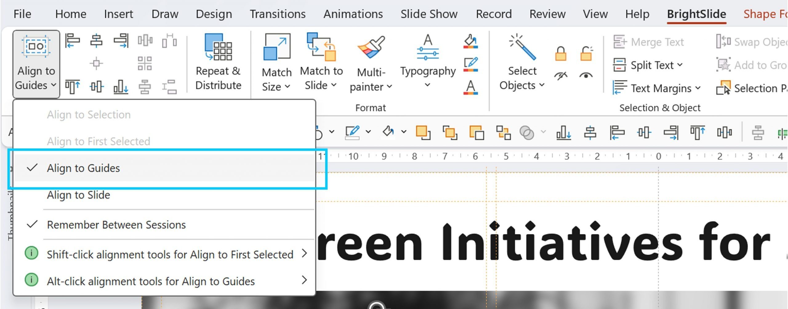 When you’ve got your guides set up, you can use BrightSlide’s Align to Guides alignment mode to snap objects to your guides. You can also Alt-click the alignment tools anywhere in PowerPoint for Align to Guides. Then repeatedly click the selected align option to shuffle through the guides. Add Shift to shuffle through the guides in the opposite direction. Sorted!