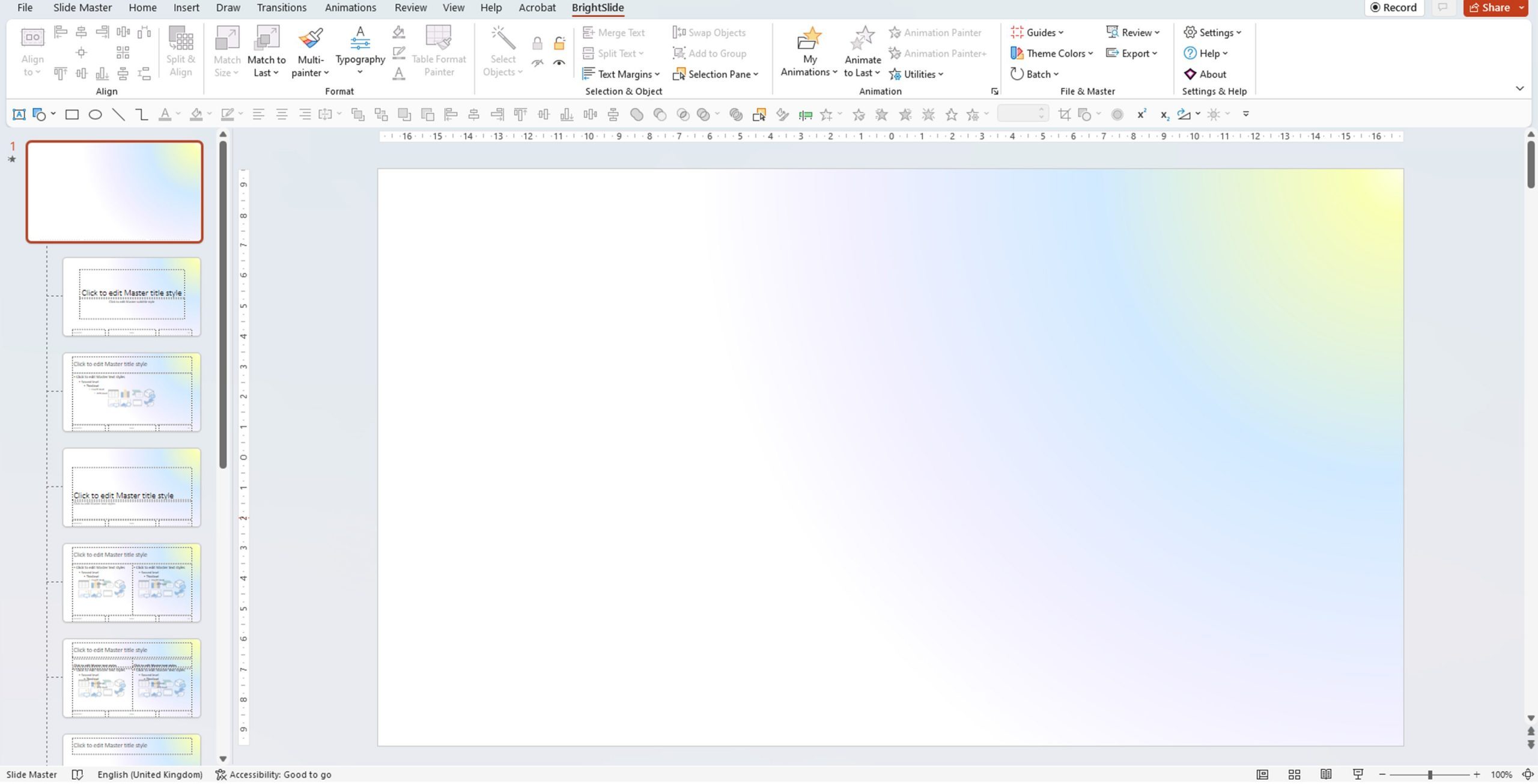 So, you want to create an animated background that will move constantly as your content changes – of course you do. To create an animated slide background in PowerPoint, we need to add our design to the Slide Master. First, go to the View tab in PowerPoint and select the Slide Master icon. Then, you can choose to edit just one master slide or every layout. For our purposes, we’ll add our design to the top slide as this will then apply it to all slide layouts.